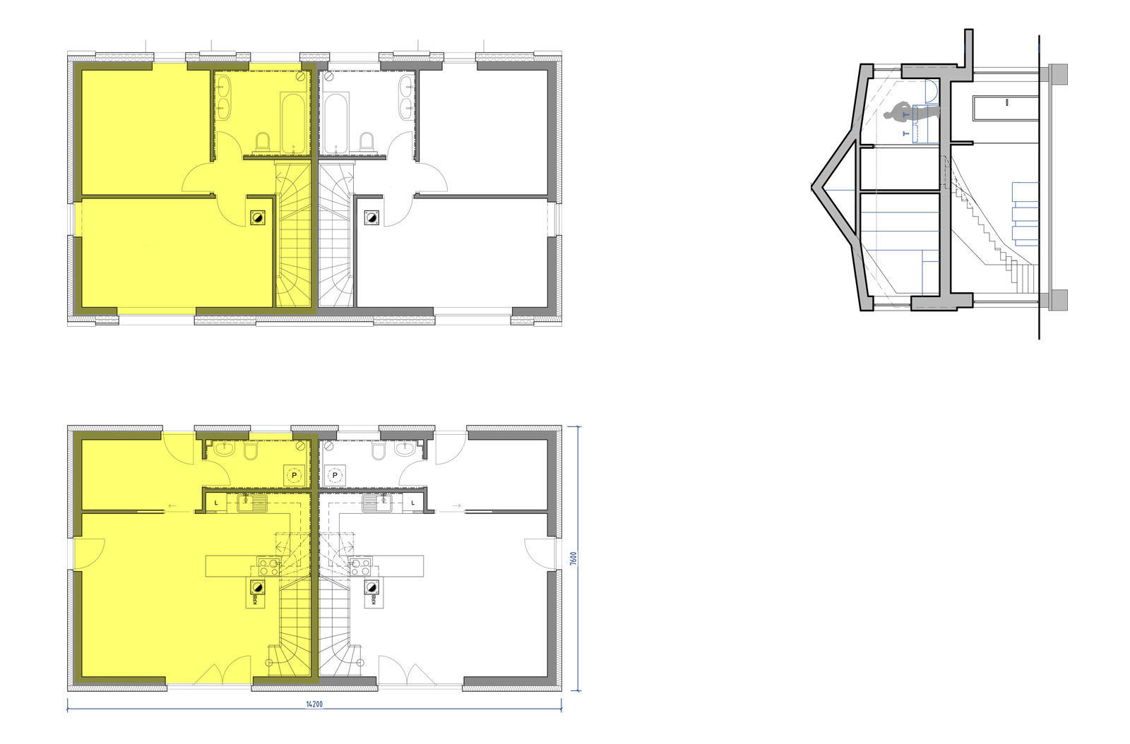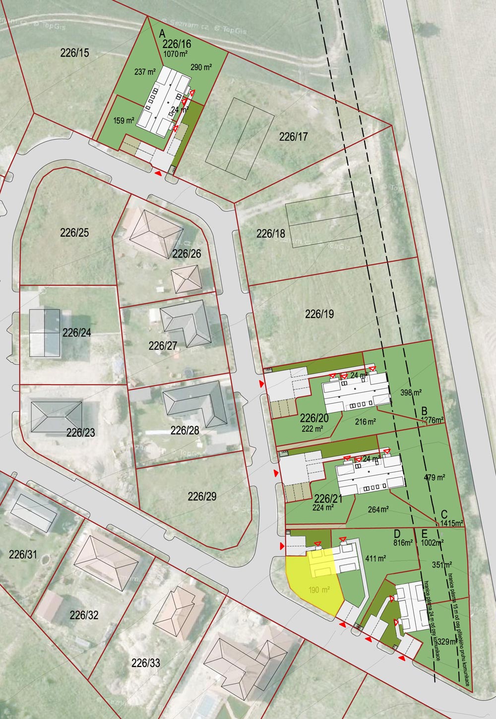 Jednogenerační bytová jednotka v domě se dvěma byty, dvojpodlažní, se vstupem a obytným prostorem na úrovní l.NP. Byt má samostatný hlavní vstup ze společných venkovních prostor a samostatný vstup na zahradu z obytného prostoru. Každý byt má vlastní zahrádku. Dispozice každého bytu jsou pečlivě promyšleny. Při návrhu byl důraz kladen na soukromí a prosvětlený interiér. Byt je akusticky oddělen od sousedních bytů. Hlavní obytné podlaží obsahuje vstup se šatnou, otevřený obytný prostor s kuchyní, jídelnou a obývákem, WC s technickou místností. Ve 2.NP je ložnice, dětský pokoj a koupelna. K dispozici jsou dvě parkovací stání. Velikost bytové jednotky je 82,0 m².
