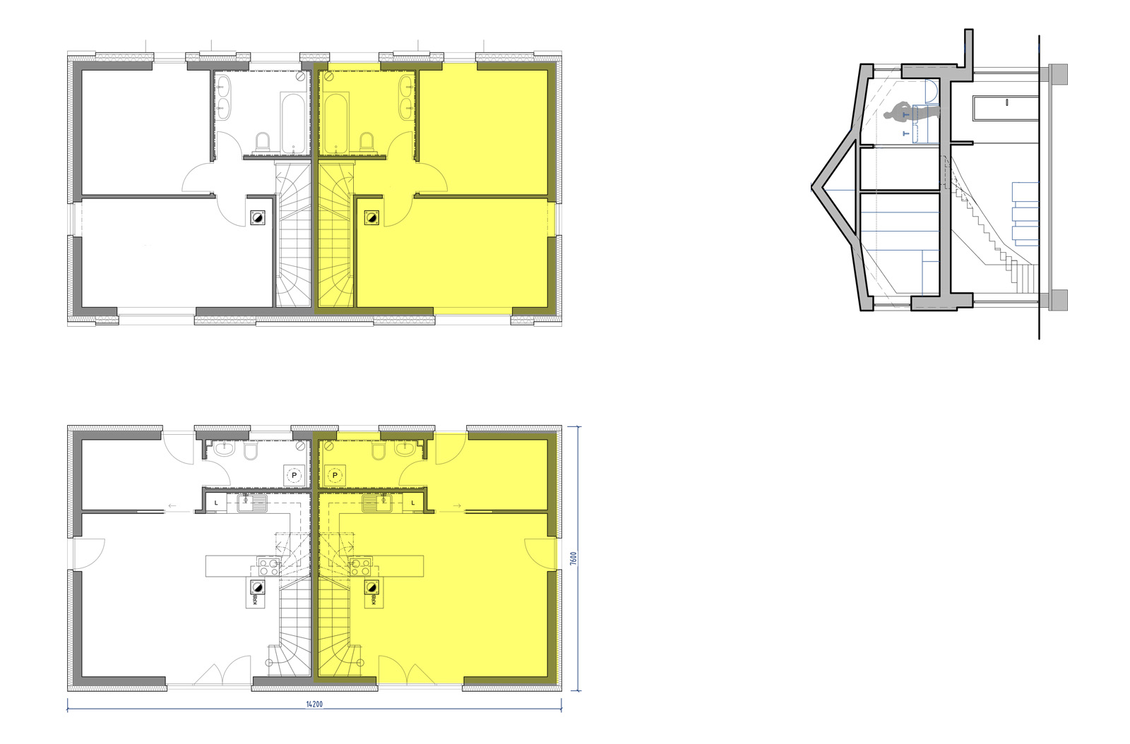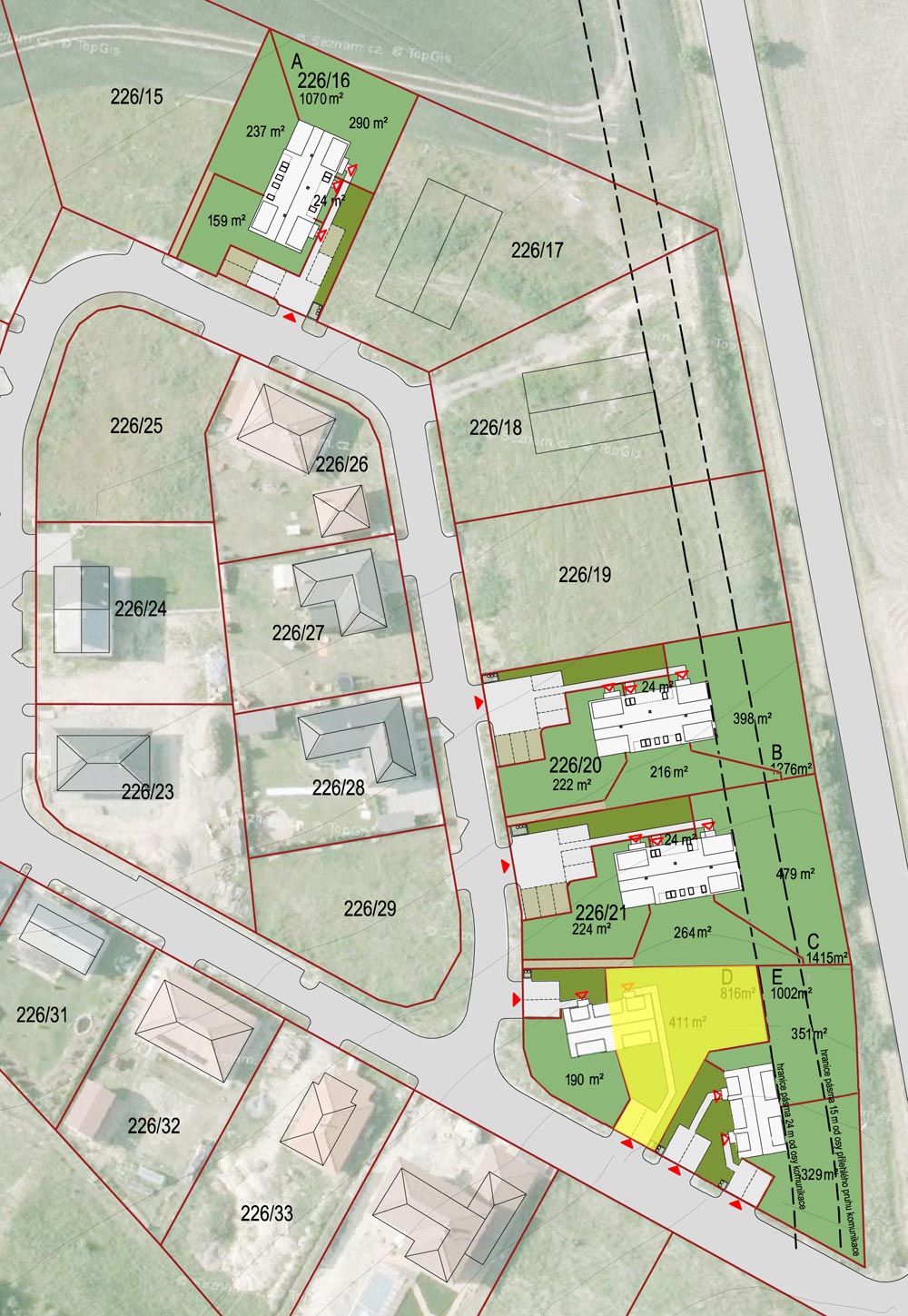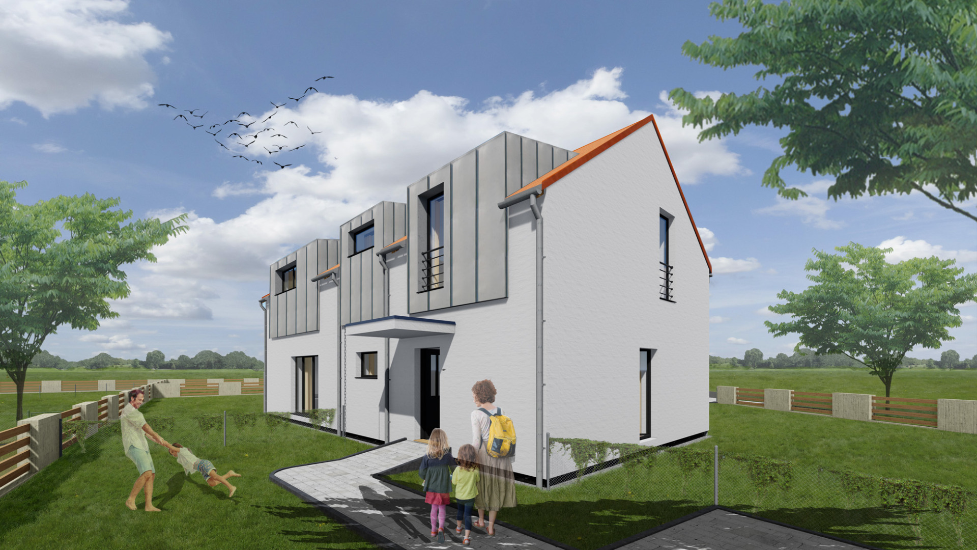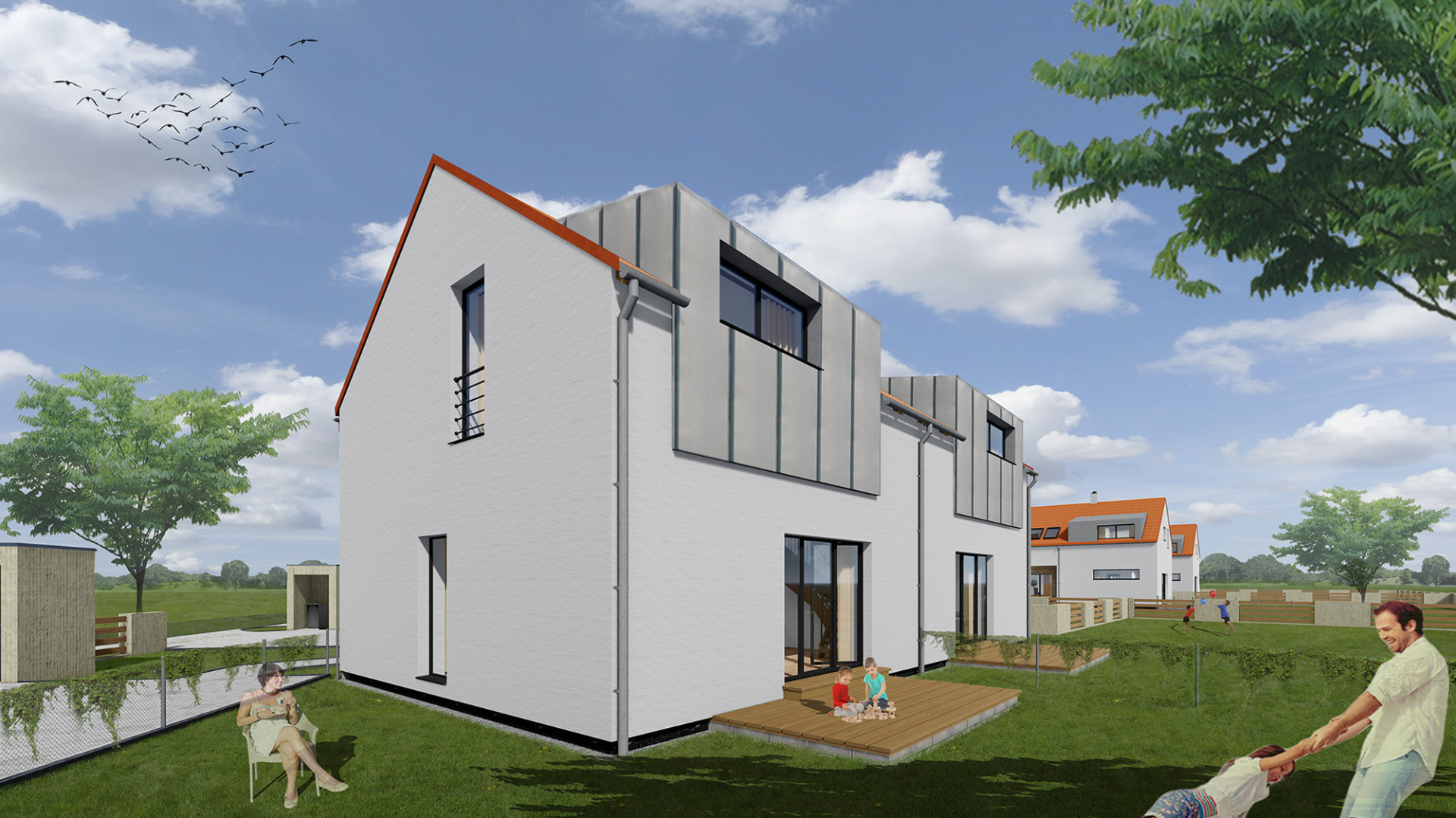 Jednogenerační bytová jednotka v domě se dvěma byty, dvojpodlažní, se vstupem a obytným prostorem na úrovní l.NP. Byt má samostatný hlavní vstup ze společných venkovních prostor a samostatný vstup na zahradu z obytného prostoru. Každý byt má vlastní zahrádku. Dispozice každého bytu jsou pečlivě promyšleny. Při návrhu byl důraz kladen na soukromí a prosvětlený interiér. Byt je akusticky oddělen od sousedních bytů. Hlavní obytné podlaží obsahuje vstup se šatnou, otevřený obytný prostor s kuchyní, jídelnou a obývákem, WC s technickou místností. Ve 2.NP je ložnice, dětský pokoj a koupelna. K dispozici jsou dvě parkovací stání. Velikost bytové jednotky je 82,0 m².